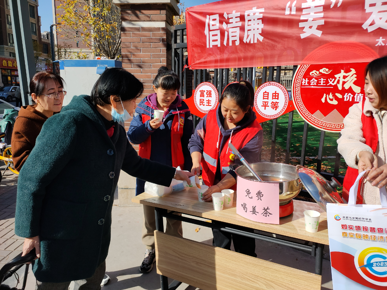 (图为社区工作人员免费送姜茶)