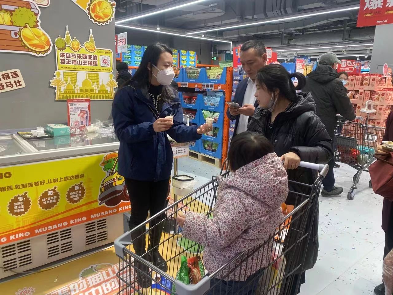 当日,在美特好超市“猫山恋”榴莲体验交互区,独特的东南亚元素视觉效果和猫山王榴莲浓郁的香气吸引不少消费者驻足围观、拍照打卡、争先试吃。“猫山恋”工作人员热情推荐试吃品类,消费者对猫山王榴莲独有的浓郁口感赞不绝口,纷纷下单。