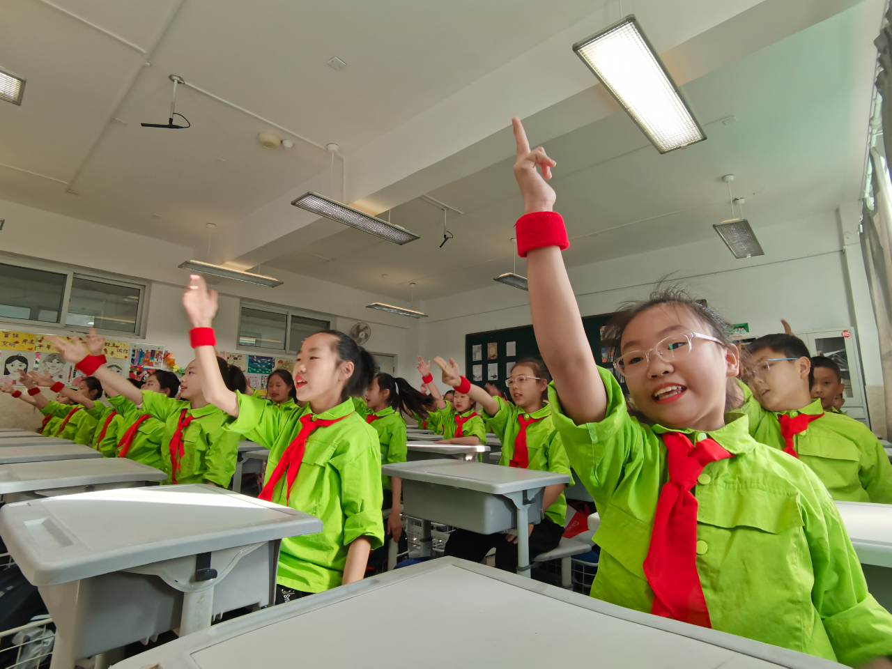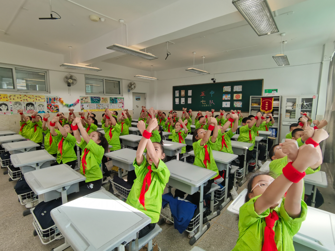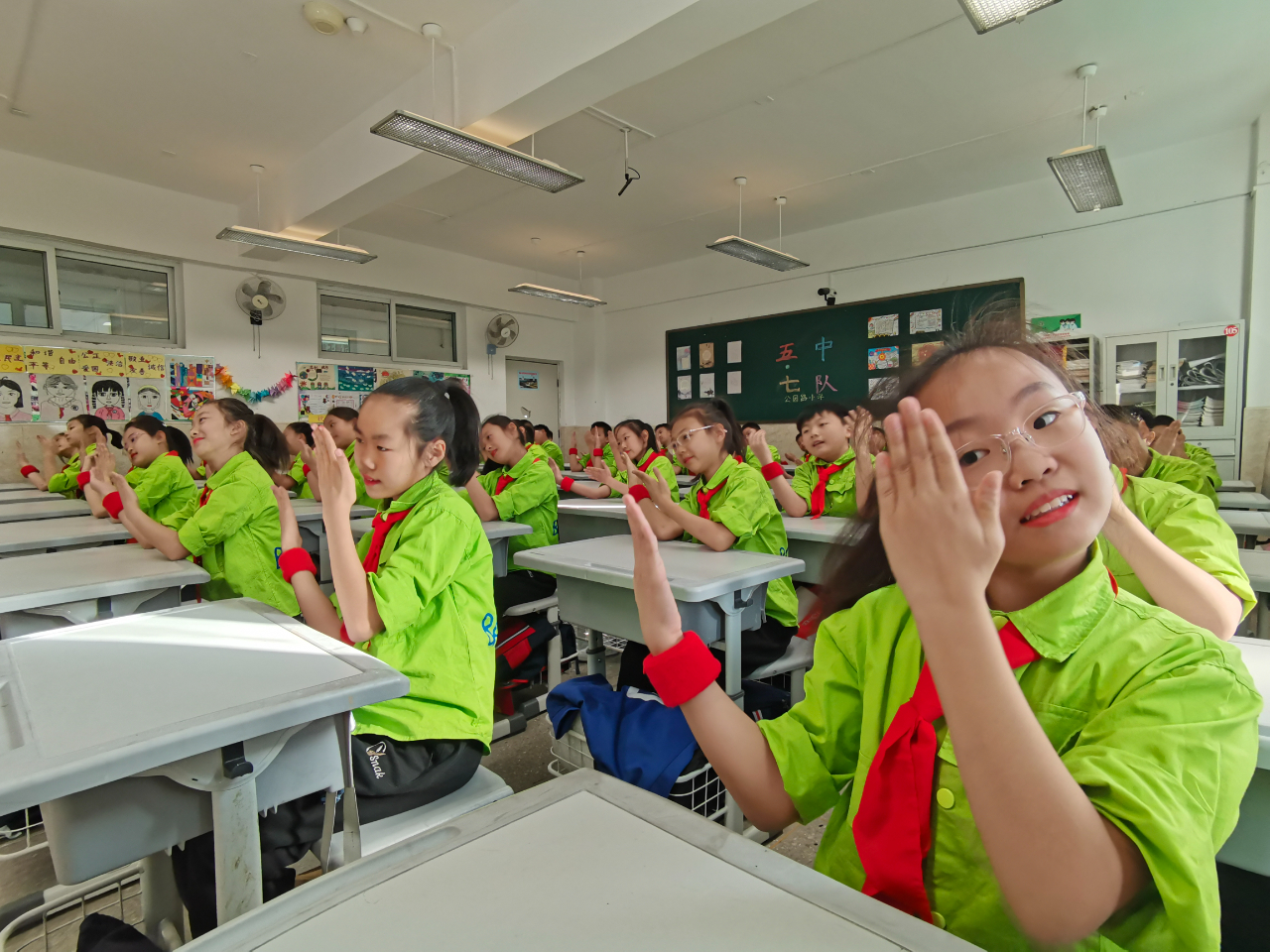 “祖国有我未来有我……”在六年三班,塑料杯成为孩子们舞蹈的道具,伴随着《祖国有我》的旋律,大家手中的杯子翻飞,与课桌轻击,成为另类“伴奏”。孩子们双腿和脚也没闲着,踏步声应和着音乐节奏。身体在律动,音乐在飞扬,教室里昂扬着积极的力量。
