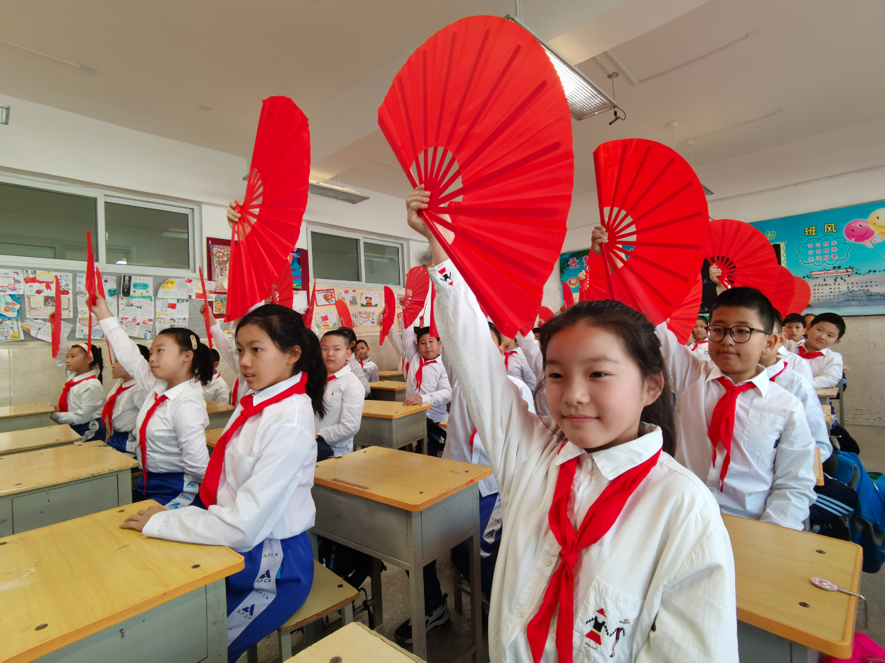 当天上午10时,做完眼保健操,公园路小学五年六班的孩子们迫不及待地拿出扇子,坐在课桌前等待。“我一声龙啸凌云志热血燃冬扶摇起看长城内外这天地山河云开笑容里……”《雪龙吟》朝气蓬勃的音乐响起,孩子们的身体随之有节奏地舞动,扇子在他们手中翻飞。音乐给人以振奋的感受,孩子们舞动着,眼睛里是抑制不住的笑意。