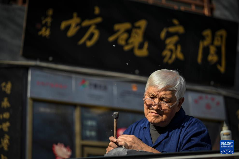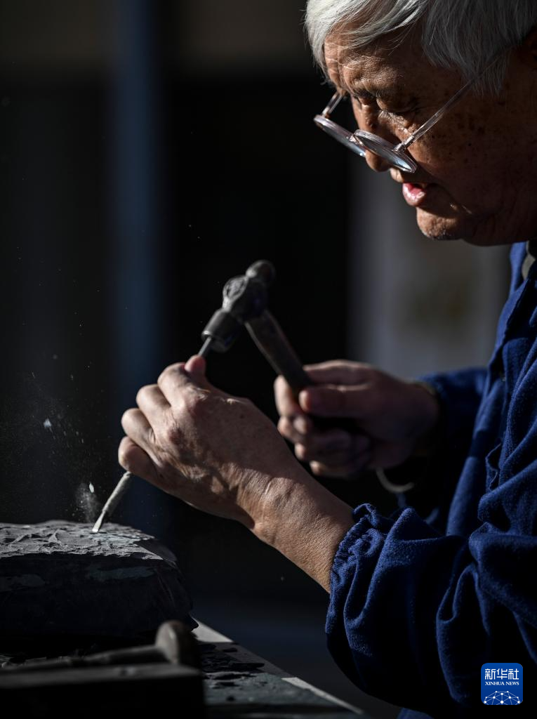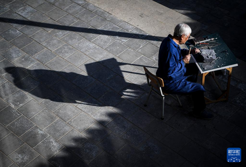 步入银川文化城,古色古香的建筑下,一位满头银发的老人在阳光下“叮叮当当”,对着一块贺兰石精雕细琢——他就是钻研贺兰砚雕刻技艺50多年的国家级非遗传承人闫森林。