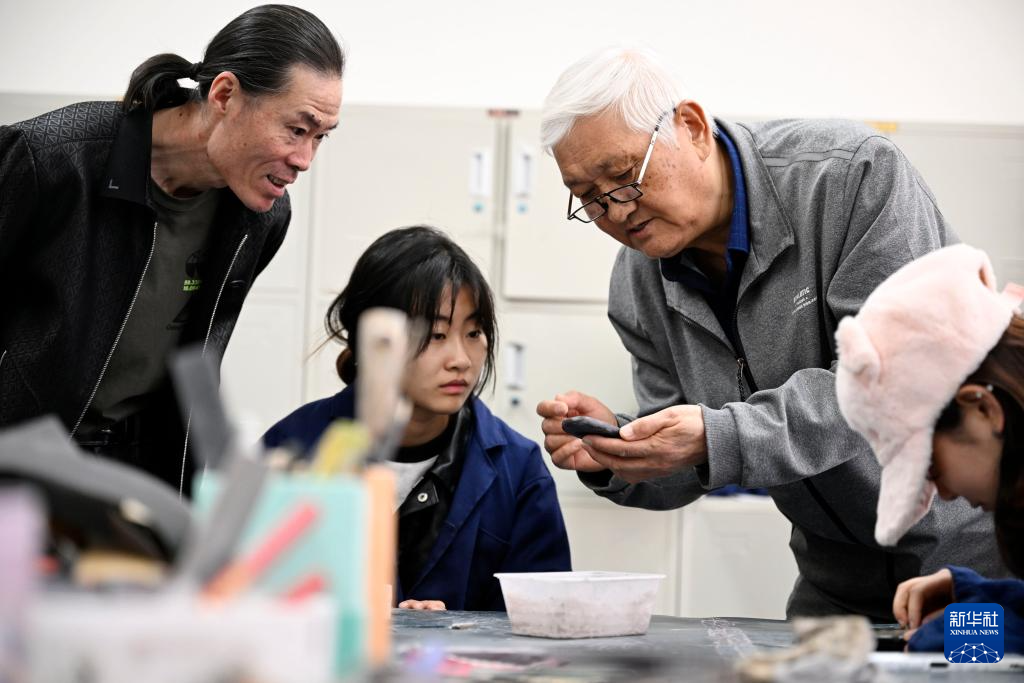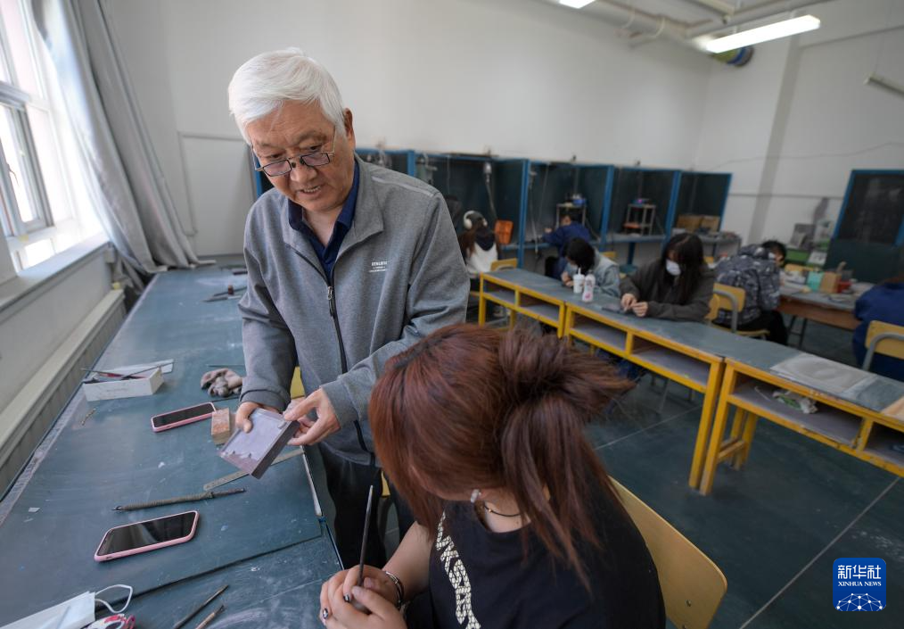 在宁夏艺术职业学院,闫森林为学生讲解贺兰砚制作技艺(4月15日摄)。