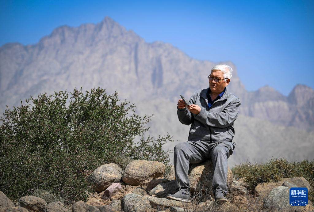 闫森林在贺兰山下品鉴贺兰石,为创作贺兰砚寻找灵感(4月15日摄)。