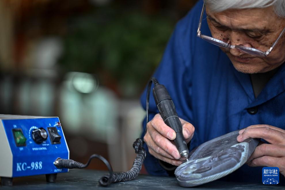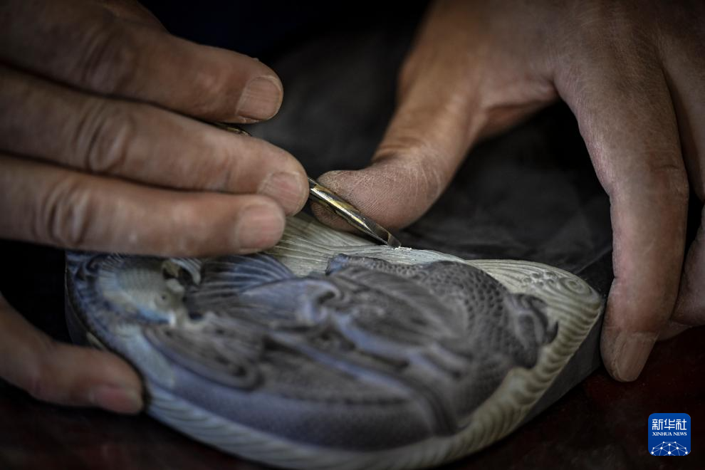 闫森林在用雕刀雕刻一方砚台上的浪花纹样(3月8日摄)。