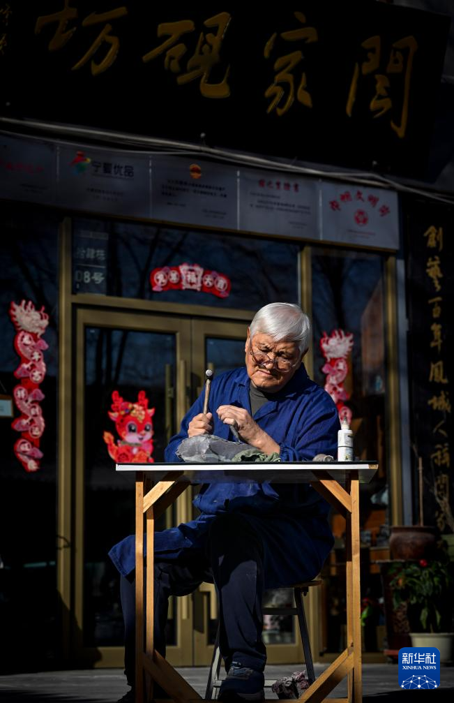 午后的阳光下,闫森林在工作室门前使用敲刀打砚坯(3月8日摄)。