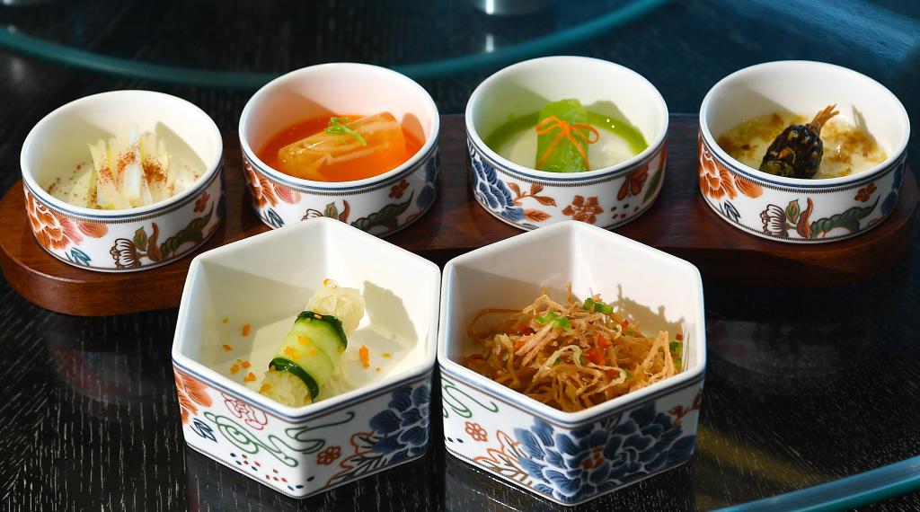 餐桌上,六个古色古香的定制瓷碗里分别盛有六道小菜,色泽鲜亮,摆盘精致,令人食指大动。