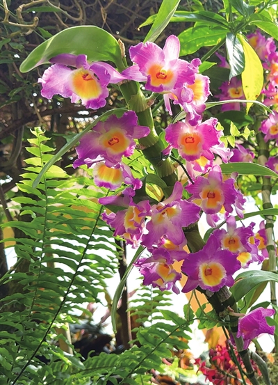 “九九”时节,乍暖还寒。然而四季花卉馆内的石斛花已经按捺不住了,春风吹过竞相绽放。紫中带黄的、粉中带白的、白中带蓝的,东一簇、西一簇,星星点点,煞是喜人。