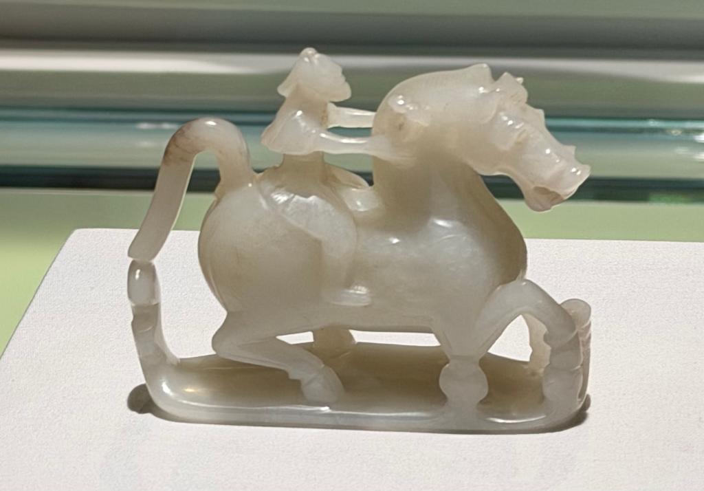 马,自古以来便是华夏文明的重要意象之一。展览中最古老的马文物——西汉时期的圆雕白玉仙人奔马出自咸阳博物院,它晶莹剔透、温润流光,刻画一位手持灵芝的羽衣仙人,策马朝着梦想之境飞升……